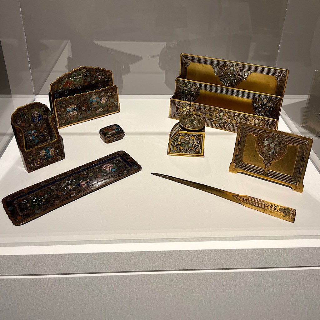I am always drawn to certain items: the Tiffany glass, the writing set, the painting of the tall man with many eyes that hangs in the stairs, the man with the pipe that makes me think of Pablo Picasso, and the woman with cigar.