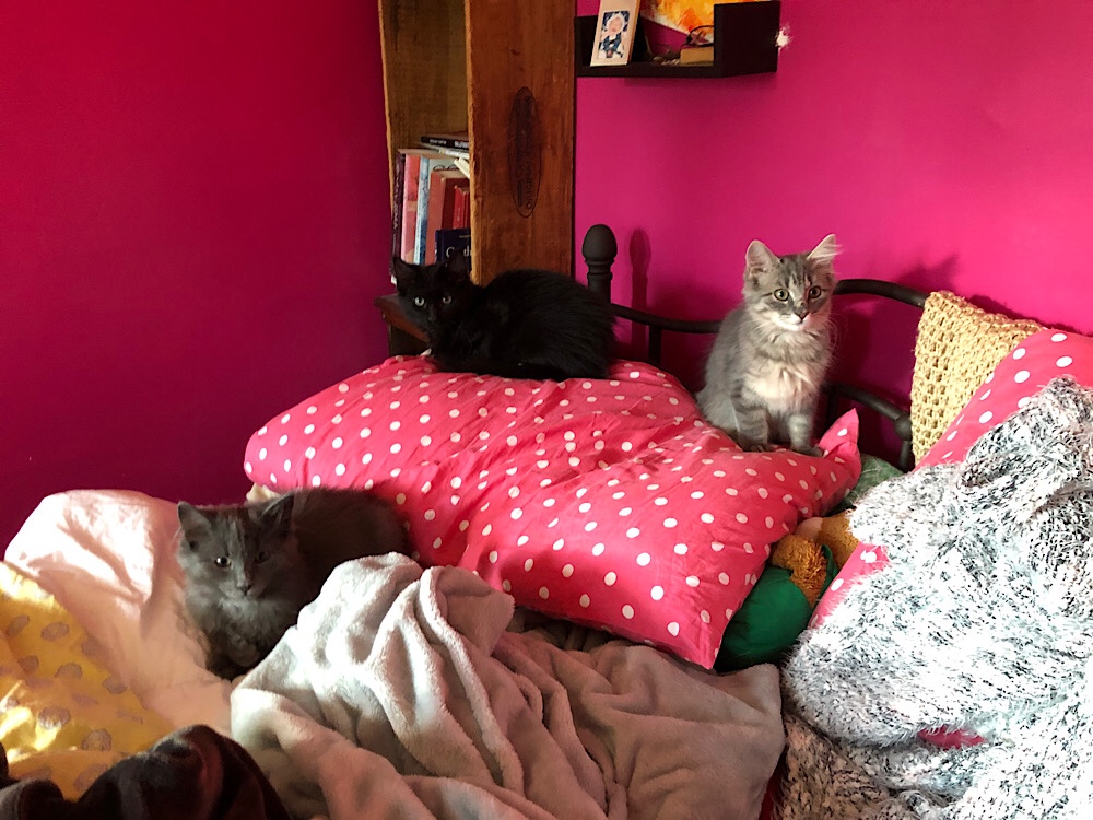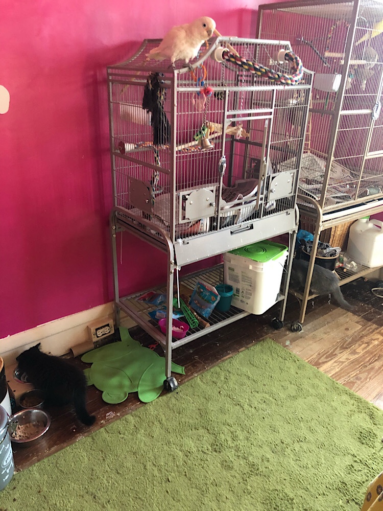 At home, the parakeet chicks look like real birds. Mama Periwinkle still won’t let her best friend Peek-a-Booboo into the cage—I tried to reintroduce her into the cage and Periwinkle flew over to her, grabbed her by the neck and threw her to the ground. So poor Booboo remains in isolation.