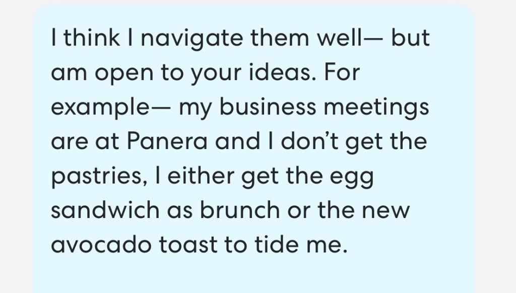 I have learned that my body reacts strongly to salt and sugar, and that I “do better” when I cook, and that I have no self-control with processed snack foods like potato chips and doritos.
