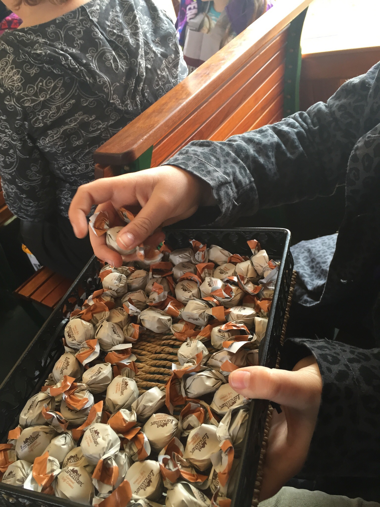 We didn’t arrive at Hershey Chocolate World until 2 p.m. They close at 6 p.m. This meant we couldn’t do everything. (And honestly this kept the expense down AND the level of saying “no.”) We worked with the staff member at the ticket desk and booked the Trolley Works tour of Hershey ($14.95/adult; $10.95 child) and the Create-Your-Own-Chocolate-Bar ($14.95/person).