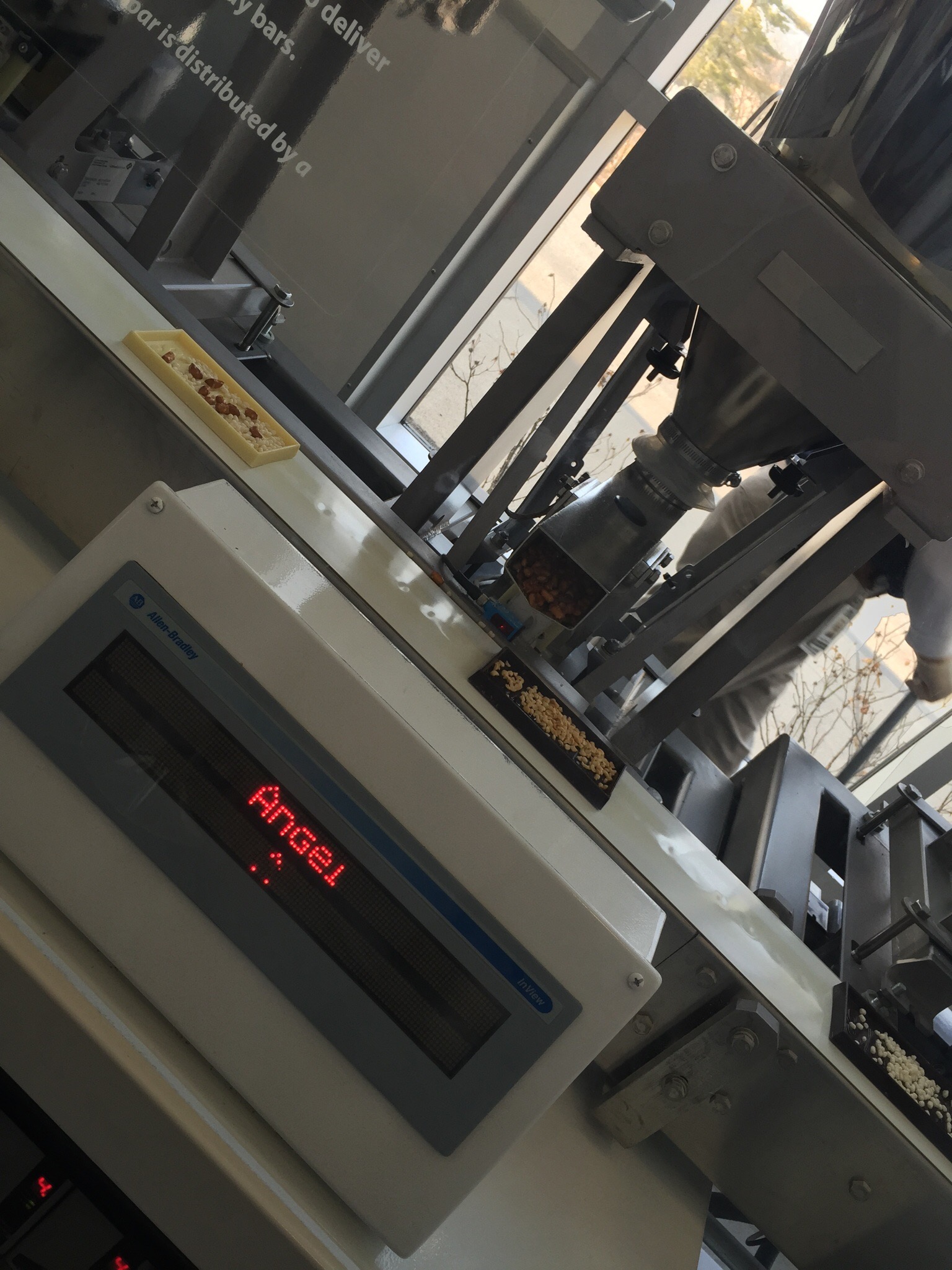 You scanned your ticket and pushed a button and your bar was placed on the production line. A screen displayed your name every time your bar reached that part of the process and you watched your bar receive its guts, its chocolate coating, everything. Eventually, it slid into a chute where a machine inserted it into a box and laser-printed your name on the side of the box.