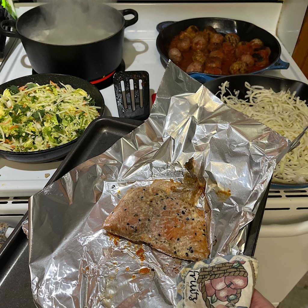Meal prep with Hungryroot groceries: superfood blend, salmon, kohlrabi noodles, beef meatballs, turkey meatballs and tortellini