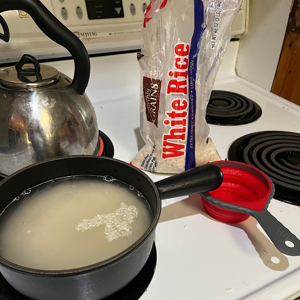 Step Two: while waiting for the water to boil, I put 1.5 cups white rice and 3 cups water on the stove to boil.