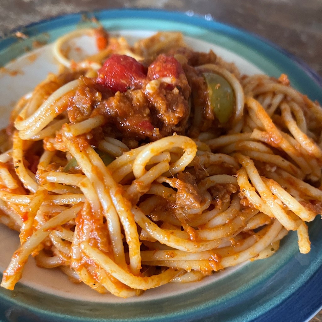 Step Seven: cook vegan chorizo in extra virgin olive oil with some scallions I found in the back of the fridge, green olives and roasted red peppers. When that’s cooked, add tomato sauce and that will be the topping for the spaghetti.
