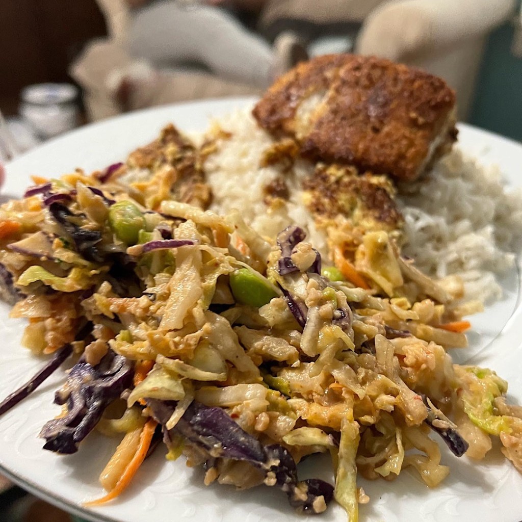 The teenager made some crusted salmon to go with leftover rice and Thai peanut salad. That was our late lunch.