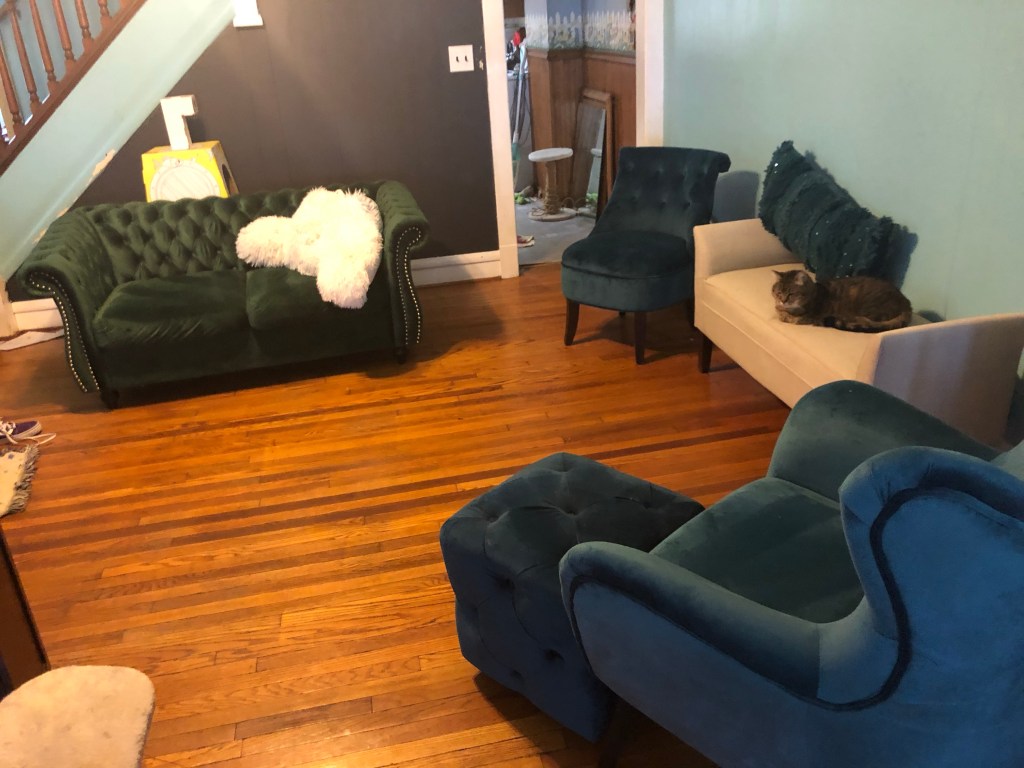 It’s an emerald green Chesterfield love seat. My daughter finds it obnoxious but I like bold touches.