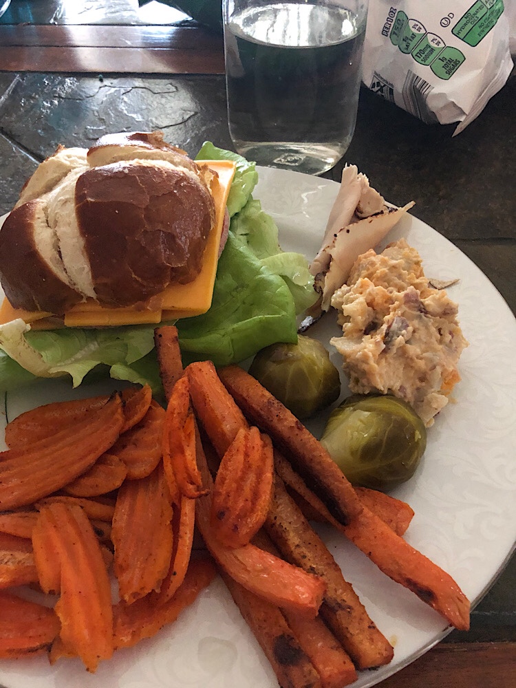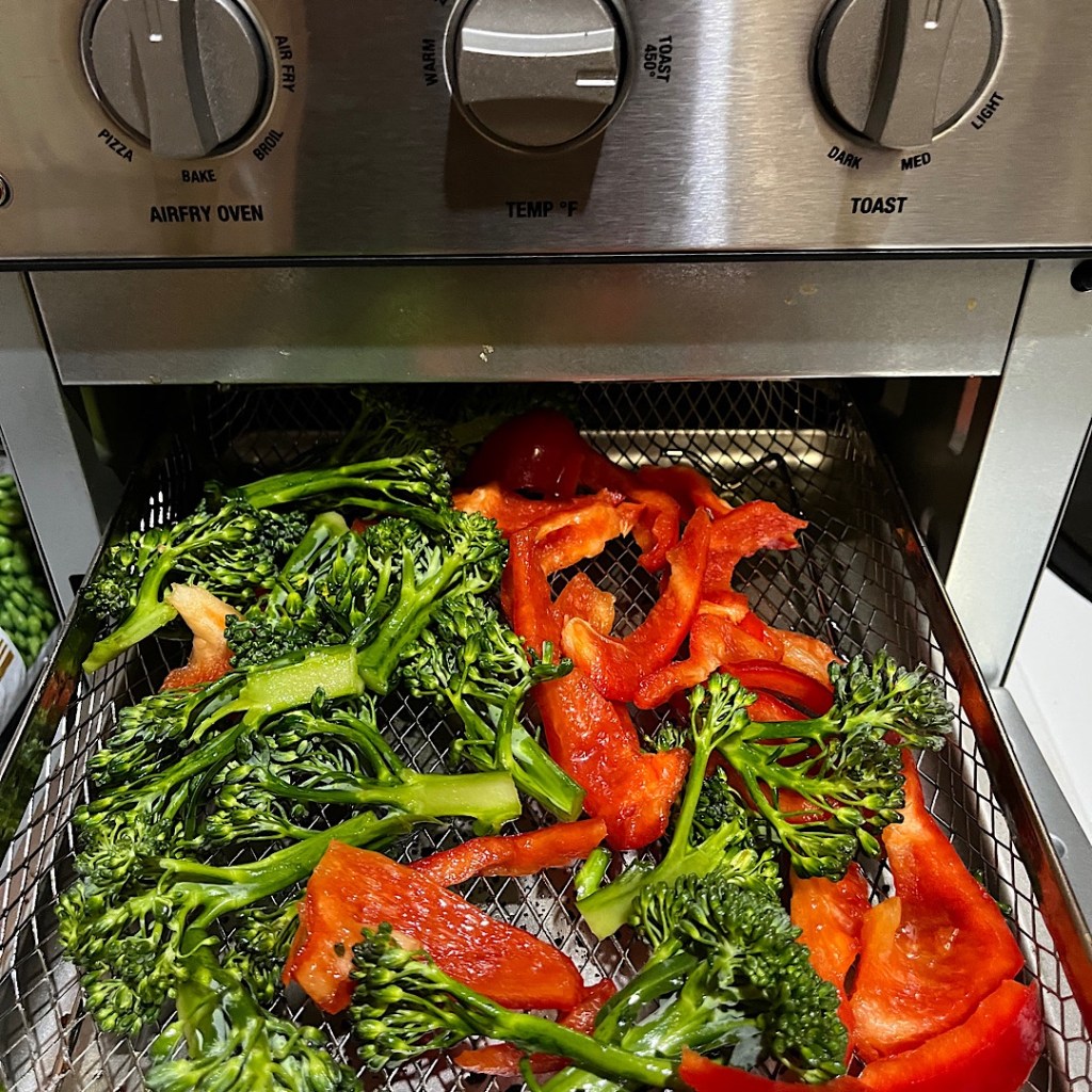 But at least I made myself a nice dinner of fig & ricotta ravioli from Lidl with Alfredo sauce from Hungryroot and vegetables (baby broccoli, red pepper, and peas) cooked in the Cuisinart air fryer toaster oven.