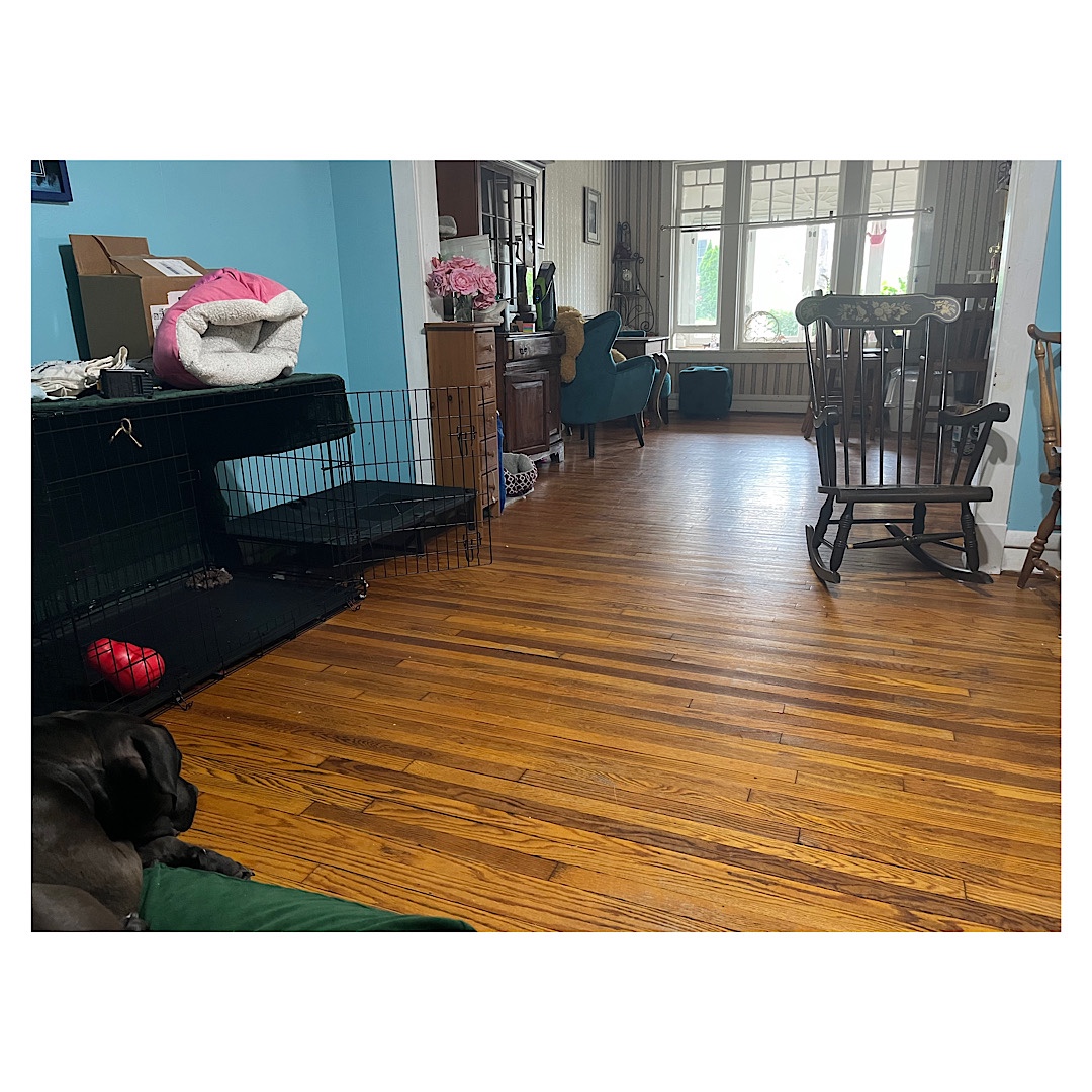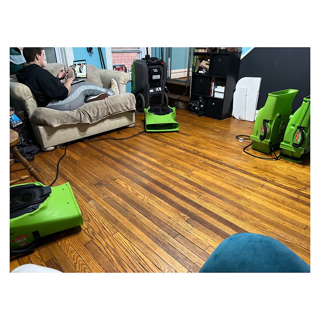 We could lose our bathroom subfloor. Our hardwood floors and walls are damp. We have five industrial air movers in the living area and a massive dehumidifier. And upstairs we have three more air movers in the bathroom and another dehumidifier.