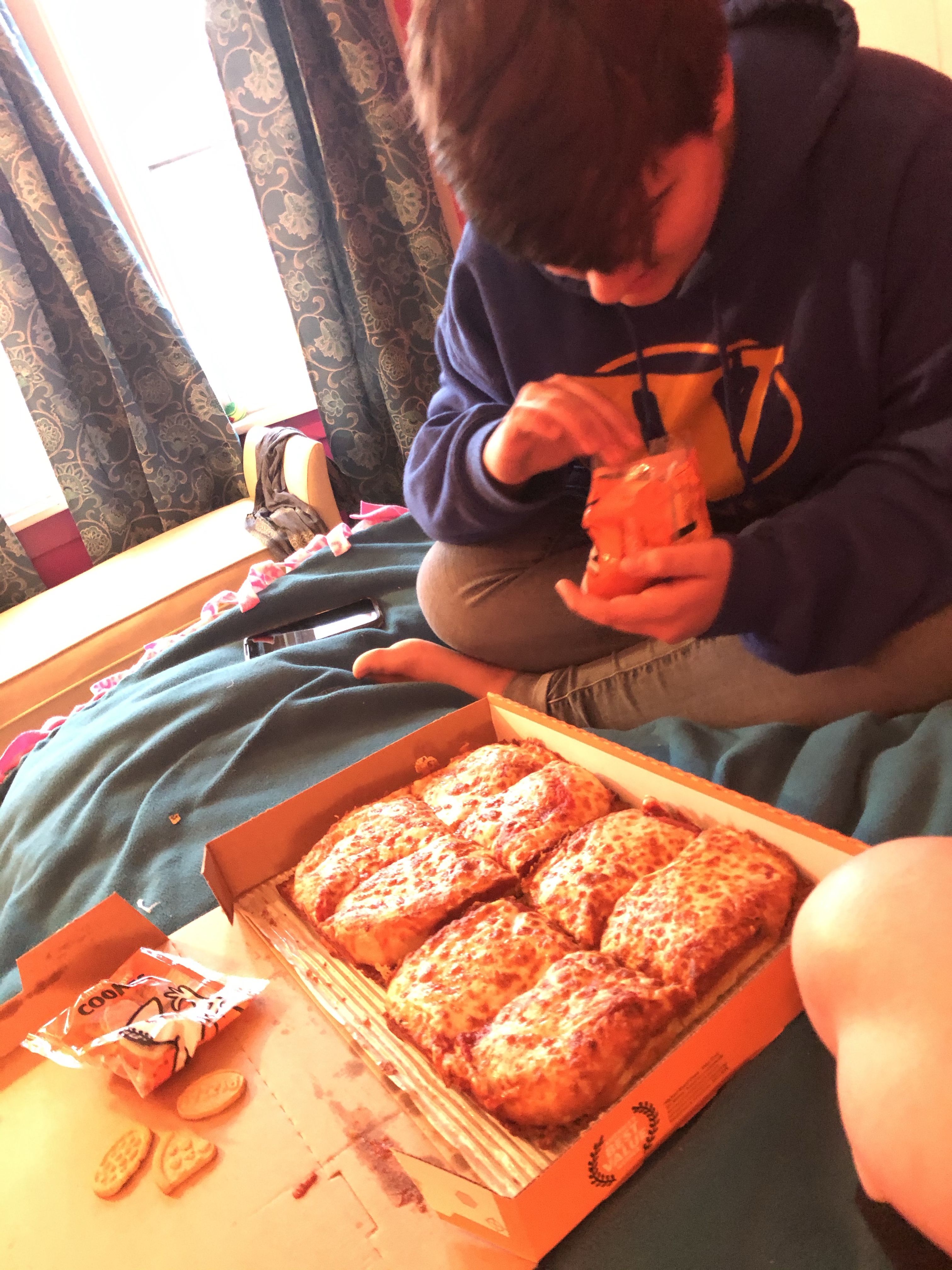 We made plans to pick up some pizza at Little Caesars so Nan could try the Batman Calzony. No matter how I tried I couldn’t explain what it was to the blind lady. So we bought one.