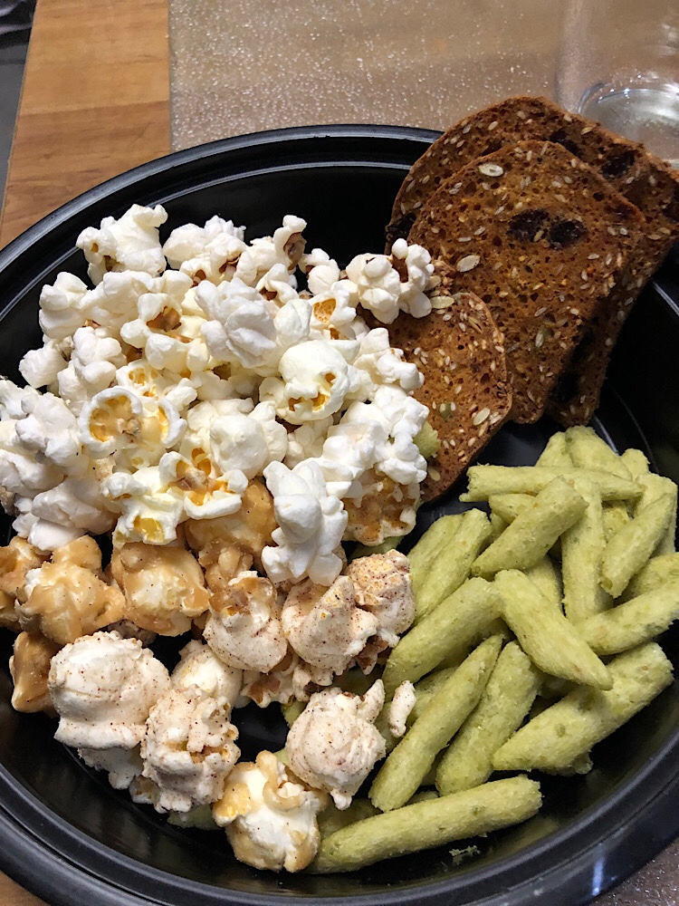 The snack I prepared were some pumpkin seed and raisin crackers, Harvest Snaps green pea snacks, Smart Pop popcorn, and Smartfood caramel apple popcorn.