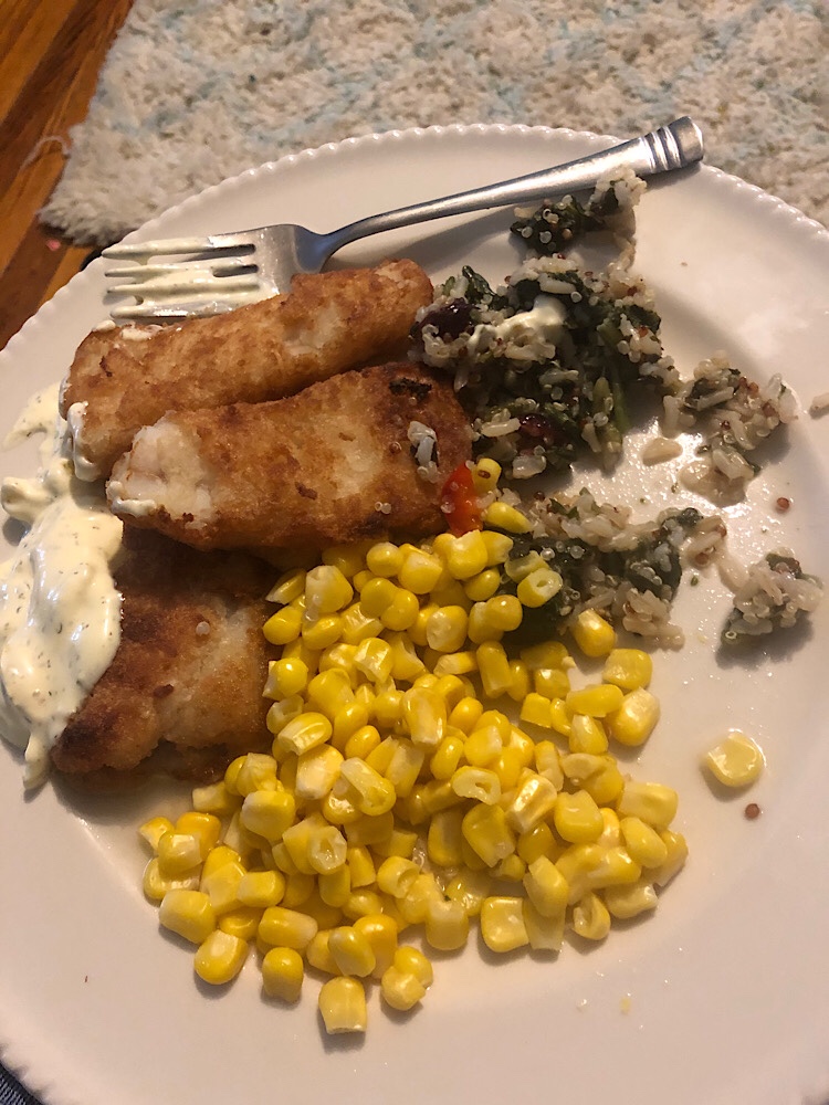 9. Some chicken I bought on clearance cooked in butter, lemon and dill. Then I sautéed some cabbage and added some leftover corn from earlier in the week and the rest of the pepper I didn’t use for yesterday’s omelette.