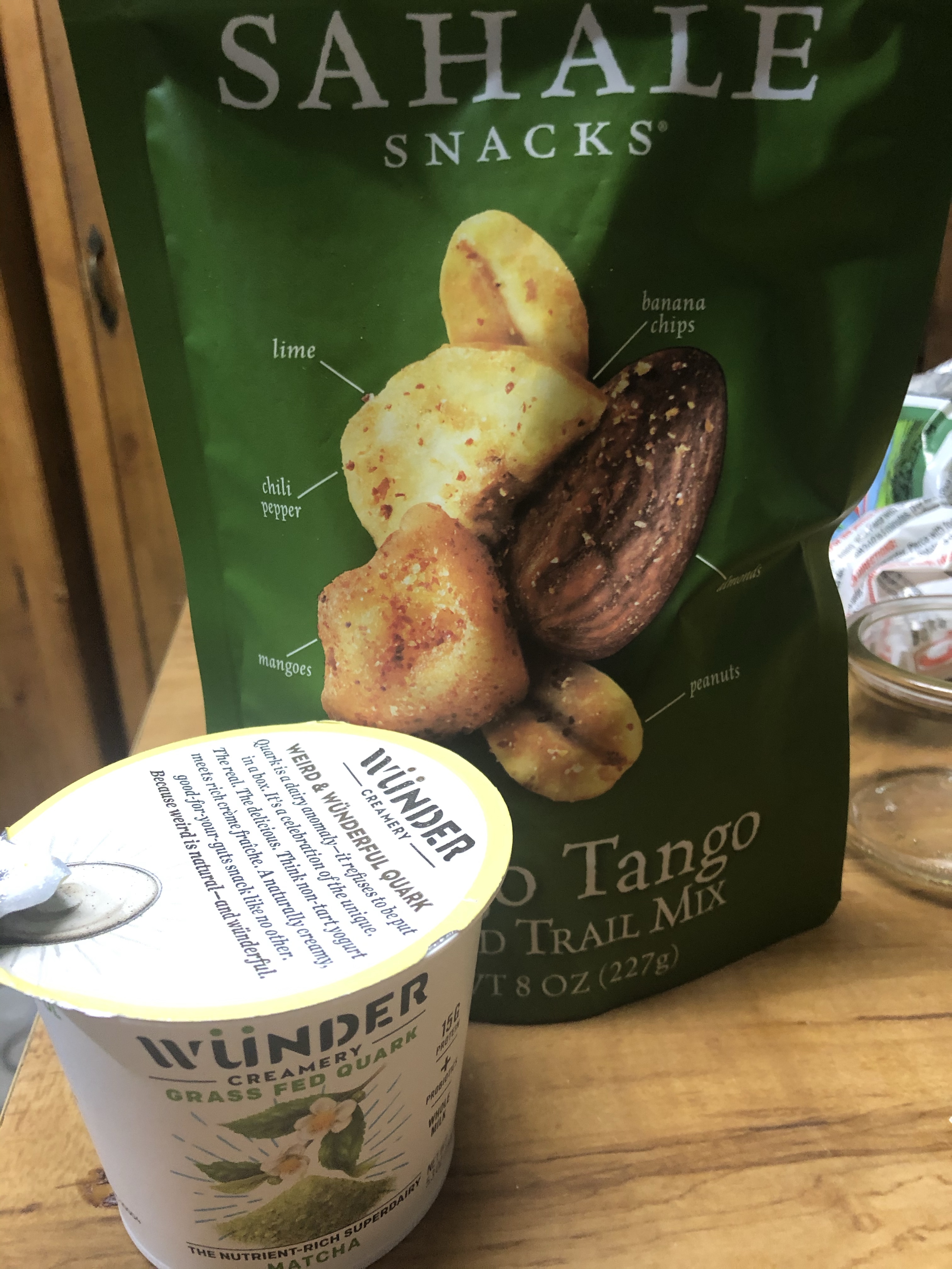 Then my new work colleague brought in doughnuts from Wegmans because someone else more or less playfully hazed her into doing it. So even though I packed this “matcha quark” for breakfast and these weird but oh-my-god delicious nuts/trail mix for lunch, I ate a giant cinnamon roll with icing.