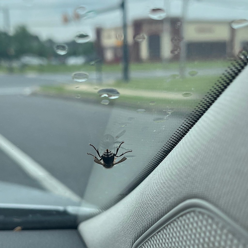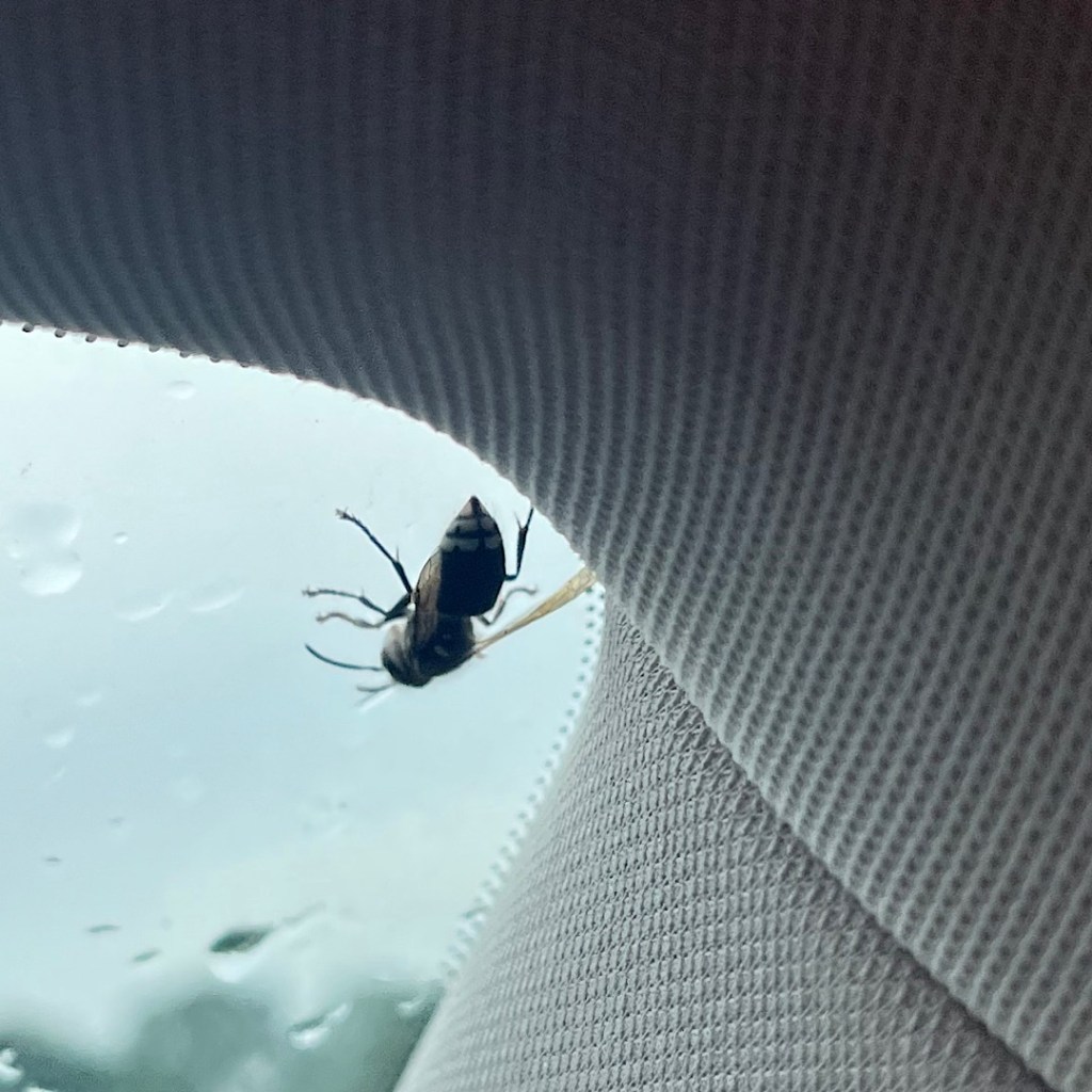 I cackle. I hang up. I get one more mile, and the bee rolls into a tight marble and disappears. He was on my windshield for about 15 miles.