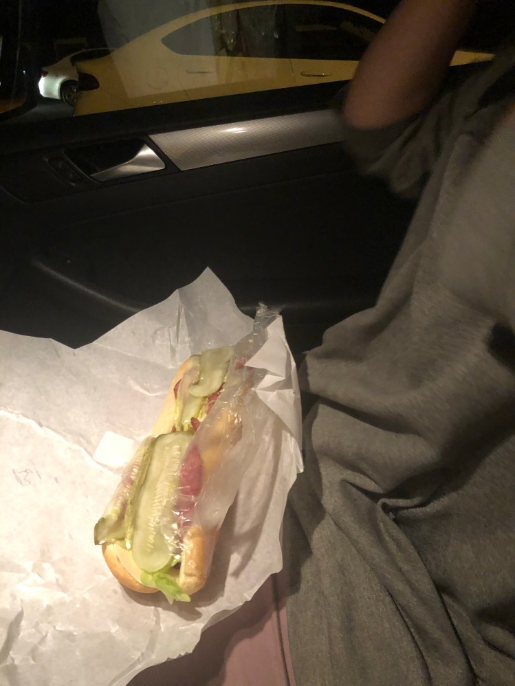 I purchased: two packs of beef jerky, one small box of minute rice for the teen, three or four teeny tiny bags of Wise snacks from popcorn to potato chips, meatballs, the biggest damn carrot I’ve ever seen, frozen vegetable medley with potatoes and garlic herb sauce, sweet potato crinkle cut fries, pork roll, Lebanon bologna, liverwurst, turkey, olive salad, a store-baked pig ear for the dog and something called “hot pepper shooters”— round hot peppers stuffed with prosciutto and provolone.