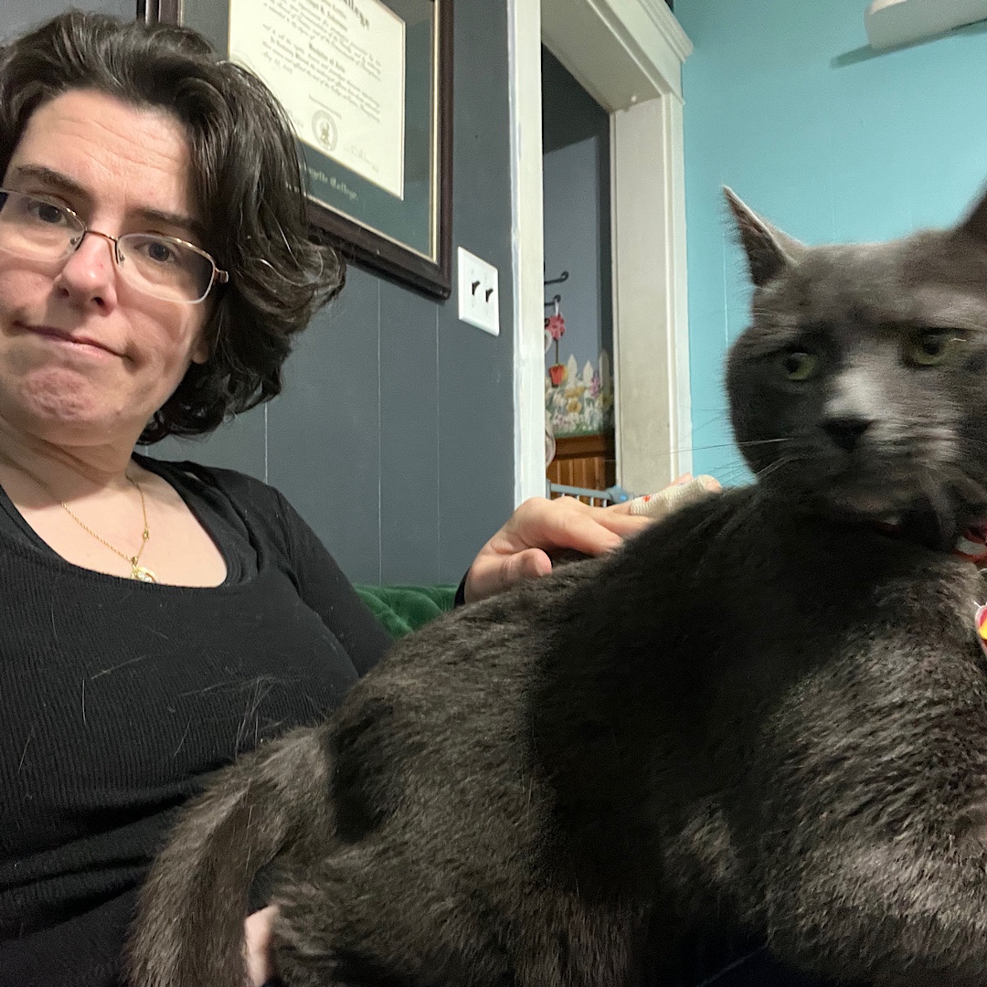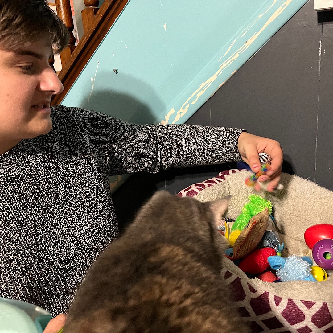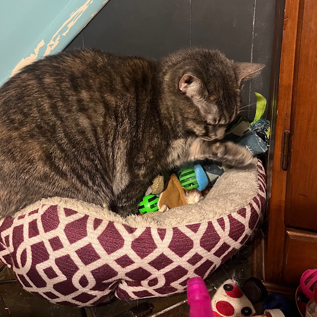 Larry and Barbara also gave me a large bag of cat toys, which we gave to foster Khloe for right now. She’s protecting them and sleeping with them like a dragon hoarding treasure.