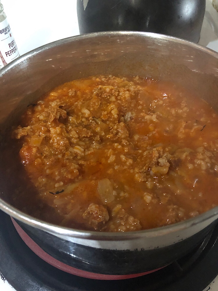 In one pan, start one cup rice. When I added the rice, I also added a sprinkle of chili powder and parsley. I use real rice so I covered that and reduced to a simmer.