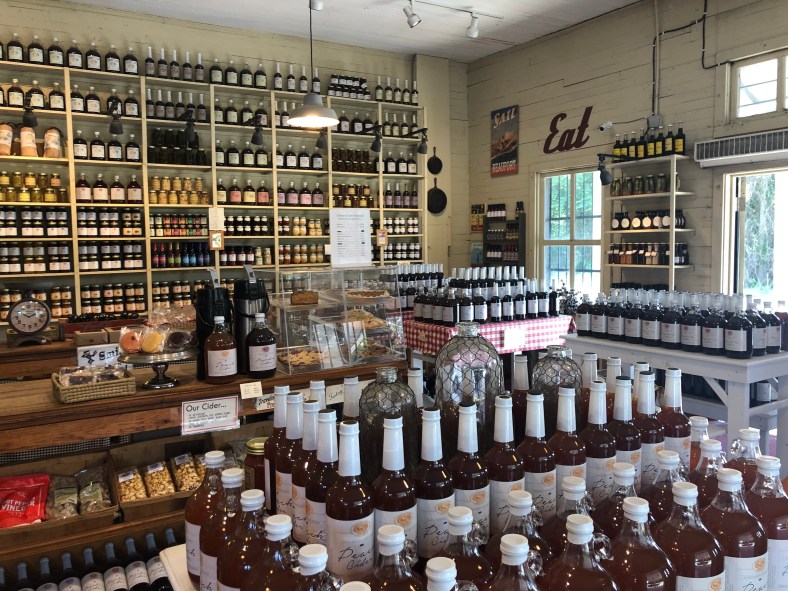 After lunch at Chicken Lickin’, we took the scenic route up to Charleston and stopped at the Carolina Cider Company. Soda, pastry, CIDER in apple, peach, cherry and blueberry. Various fruit butters, I bought sweet potato butter and a bottle of pecan syrup. And the alligator stick. And a butterscotch root beer.