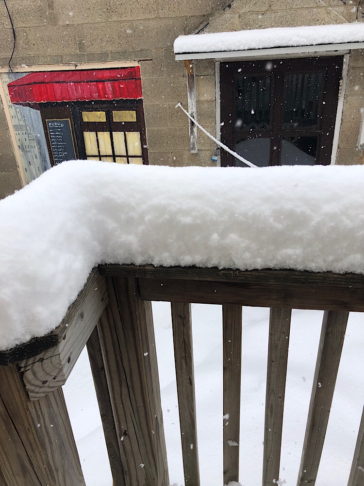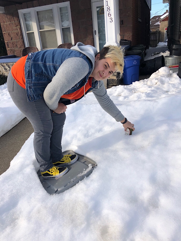 We had two snowstorms in January. During one of which, the first actually, one of the Teenager’s college friends spent the night. (Photo: Here they are at about 10 p.m. having a snowball fight with one of our neighbors, a high school friend of the Teen.) The College Friend hails from Los Angeles, so this was her first snow. And we bundled her up in home-knit hats and gloves and sent her out to shovel and play in my snow boots. Because Lord knows I am not going out in that if I don’t have to.