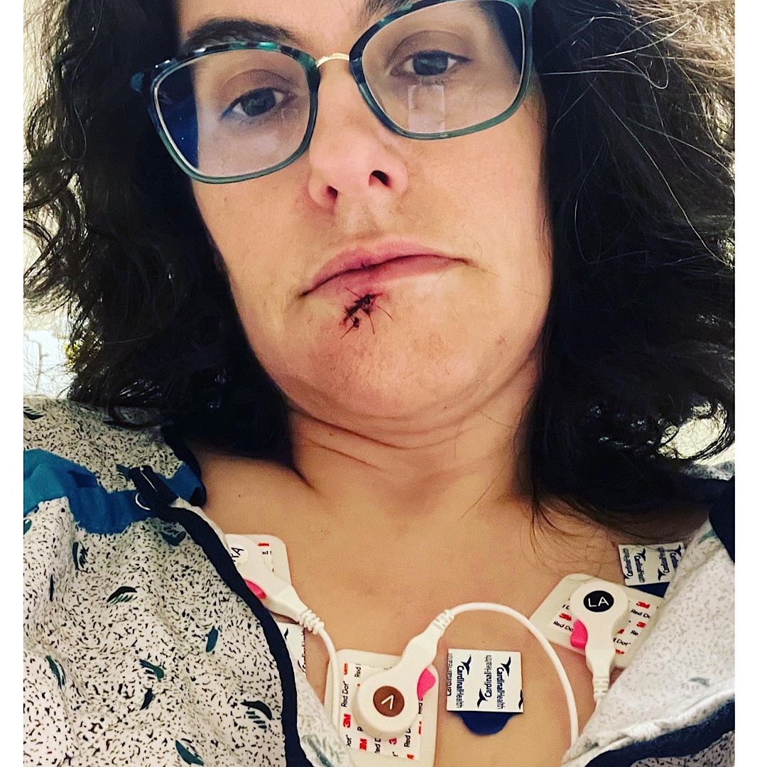 The doctor finally had his chance to shoot up my face with lidocaine (that second shot was a bitch) and sew up my lip. We irrigated the wound by me holding a basin under my face and him pouring the solution over my face so I ended up with quite a bit of liquid and a little bit of blood on my gown and down my chest.