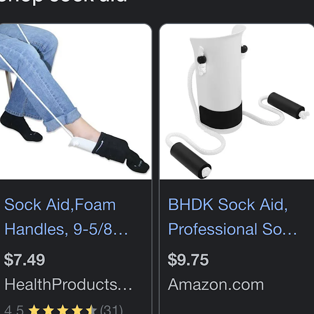The occupational therapist I met asked me what my everyday challenges were. I answered that my biggest challenge was dealing with my socks and shoes. She showed me an extended shoe horn and a sock aid. The sock aid is basically a big piece of plastic pipe with a jump rope attached to it. You put the sock on the end of the pipe, stick your foot it and pull the tube away from the sock with the rope.