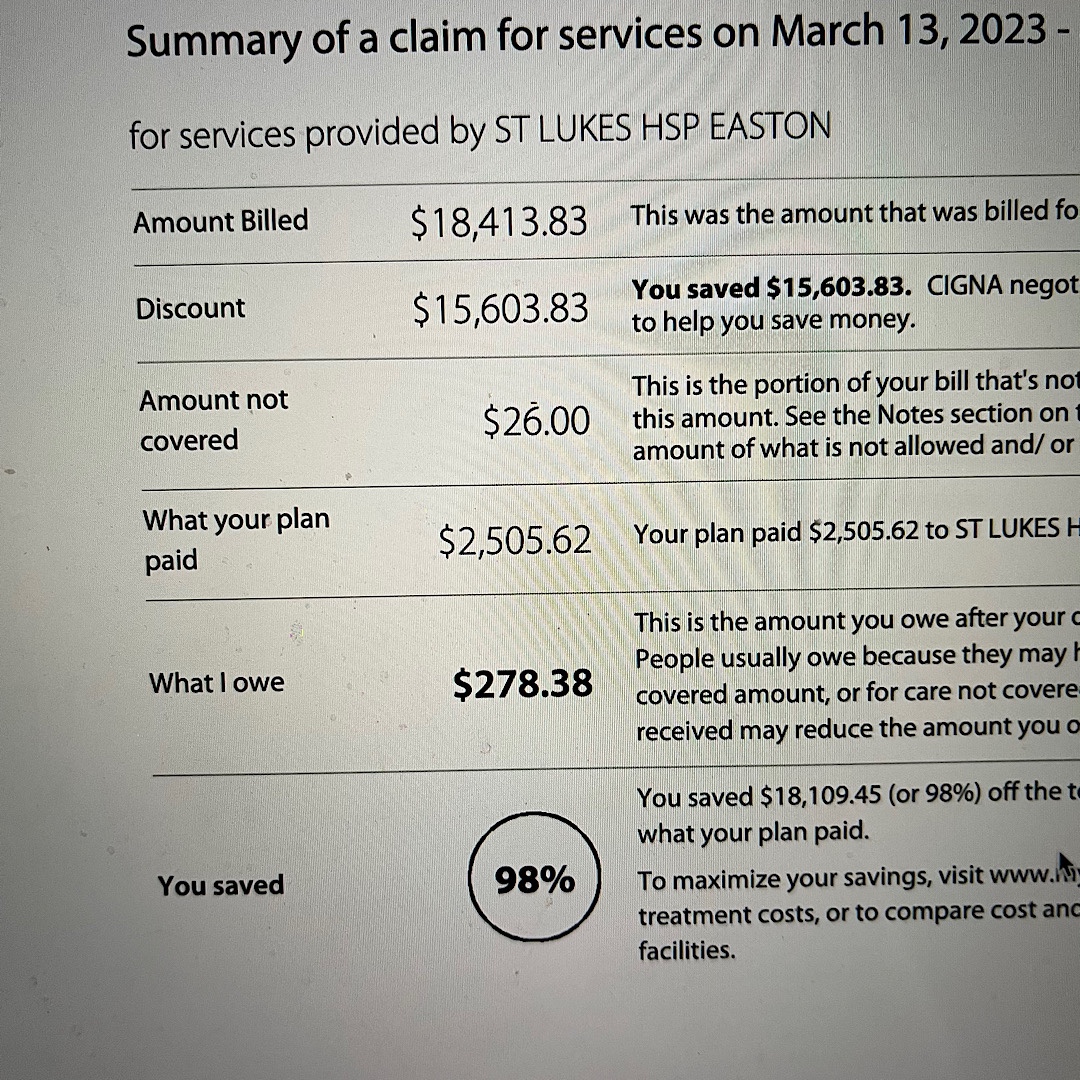 Brief interlude while I am thinking of it. My hospital EOB came yesterday, as did updates as to some of my other medical visits. It’s obscene to see the battle between medical providers and private insurance companies. When did this become an acceptable model of business? The hospital charged my insurance company almost $18, 500 for one day of services. The insurance company pays a pre-negotiated rate of $2,500 and I get bill about $300.