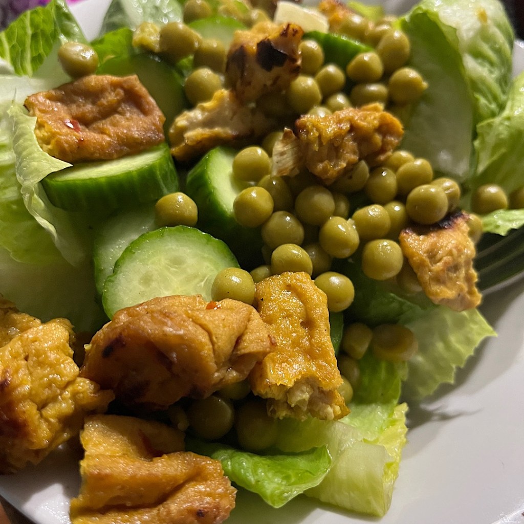 6 p.m. The Teen and I make salads with tofu nuggets and romaine and cucumbers. The Teen devours heaps of romaine and cucumber. With a homemade fresh lime dressing.