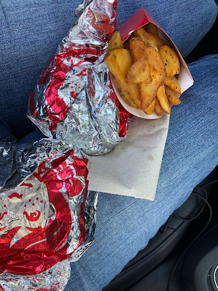 So, our first stop was Wendy’s. We ordered a chicken biscuit with honey butter combo, making the potatoes a medium (which honestly was too many potatoes even for the two of us) and an unsweetened iced tea. The bill was $3.70. I had $3 cash and Nan had the 70 cents.