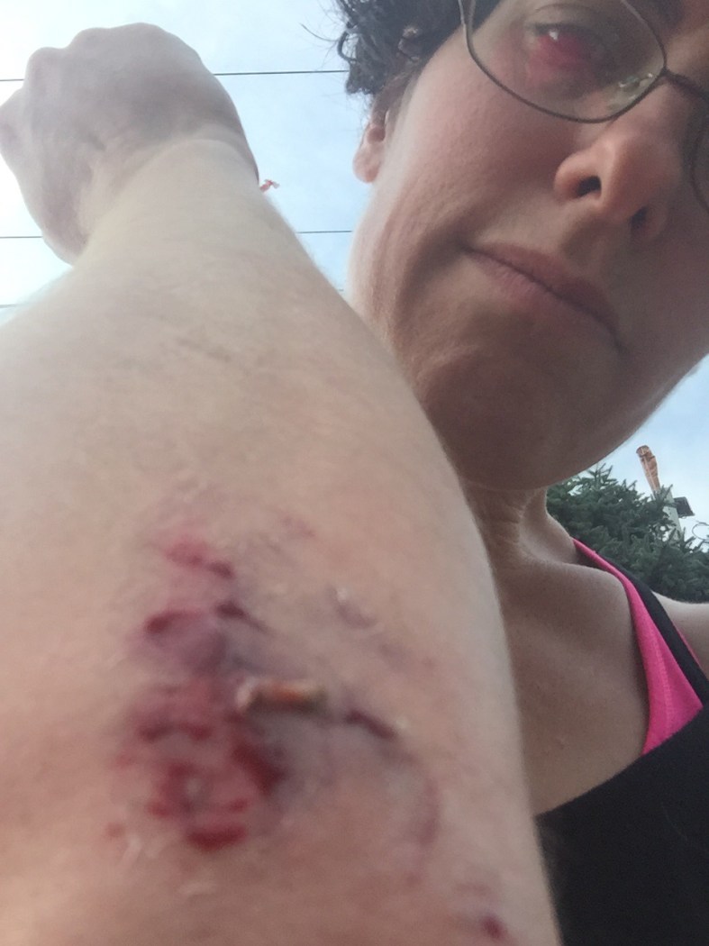 3/4 of a mile from home, I tripped and twisted my ankle. My husband went home for the car. My daughter kept me company. We took photos of my wounds.