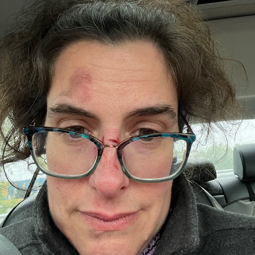 But then, upon leaving The End, the Teenager hopped over a tiny pile of stones to avoid going the long way to the parking lot. I followed. And my good/stronger ankle went out on me, causing me to slip in my slightly healed walking boots, and somehow I bounced off Joe’s parked car, narrowly avoided a concrete parker marking with rebar sticking out of it and smashed my right hand, nose, glasses and face into the macadam.